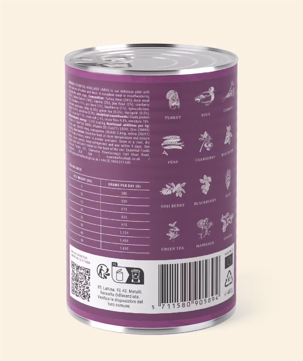 ESSENTIAL HIGHLAND LIVING PÂTÉ är vår härliga paté med köttbitar av kalkon och anka för vuxna hundar. Serveras som komplett måltid eller som underbar toppning, den är spannmålsfri och har enbart naturliga ingredienser och helt enkelt underbart god.